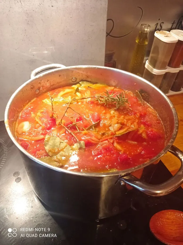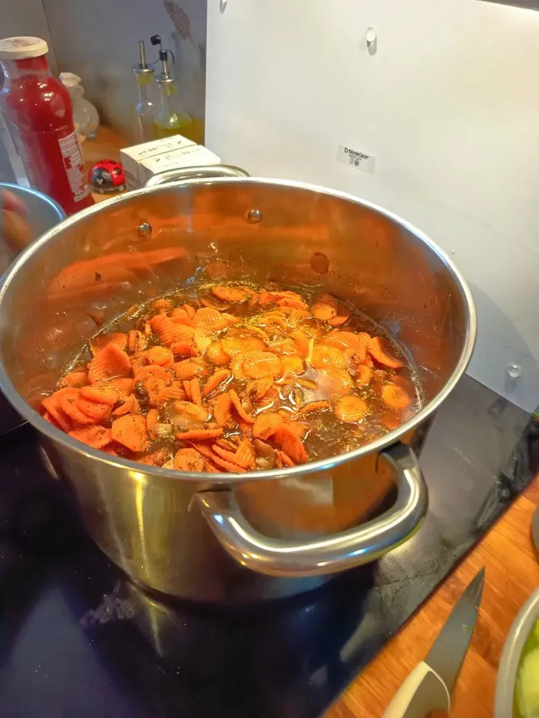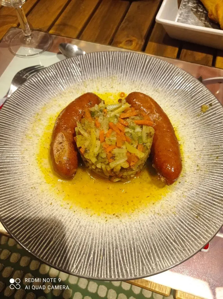 Saucisses fumées cuites dans un bouillon de légumes et sa julienne